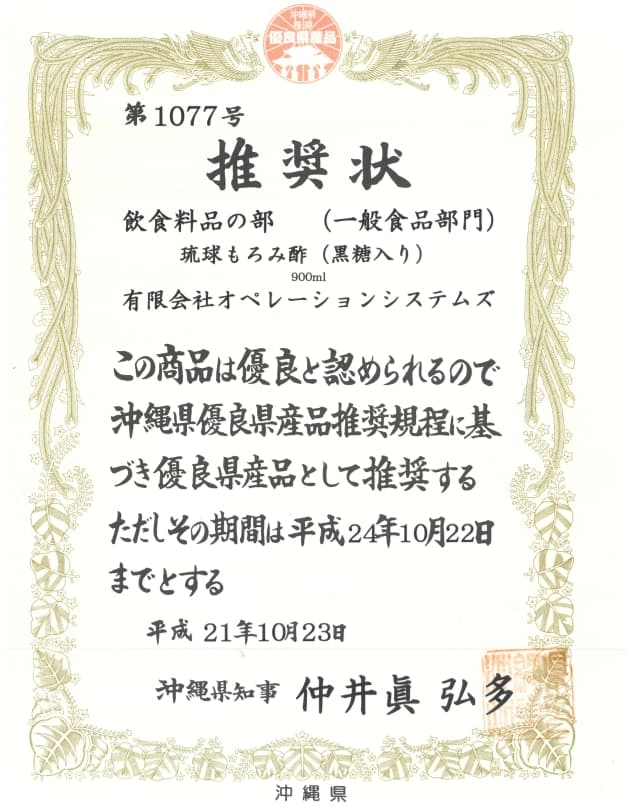 「琉球もろみ酢 黒糖入り」・「琉球もろみ酢 シークヮーサーエキス入り」が沖縄県推奨優良県産品に選出